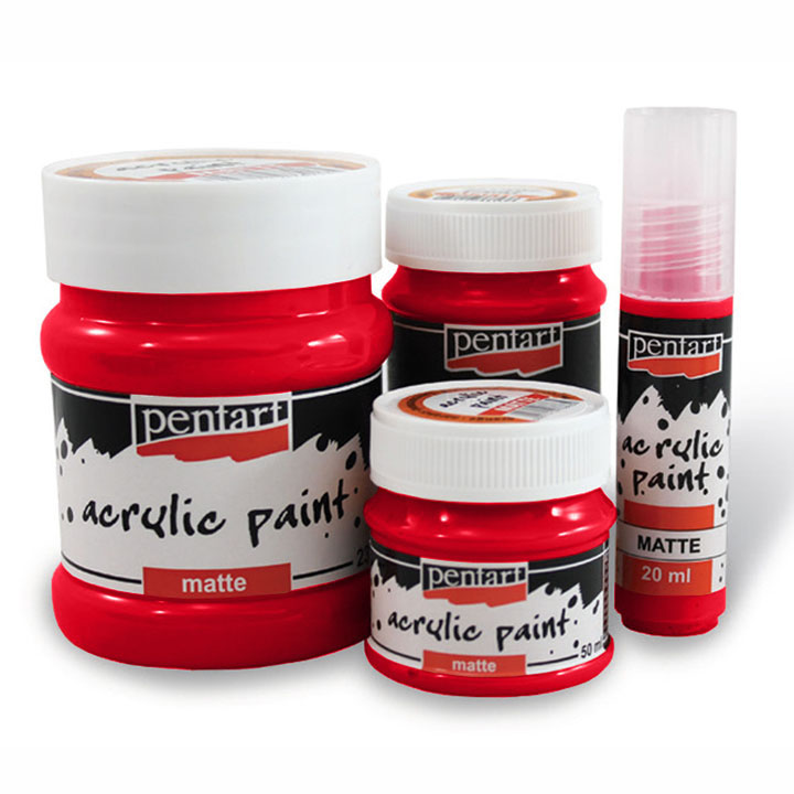 Bojë akrilike e markës PENTART është me bazë uji, me një shtresë mat dhe mund të hollohet me ujë. Ofron një gamë të gjerë ngjyrash. Kjo bojë ka aftësi të lartë mbuluese dhe mbetet rezistente ndaj ujit pasi të thahet. Është ideal për sipërfaqe të tilla si druri, letra, guri, kanavacë, terrakota, suva, polistireni etj. Vëllimi: 230 ml. E disponueshme në 28 nuanca ngjyrash.